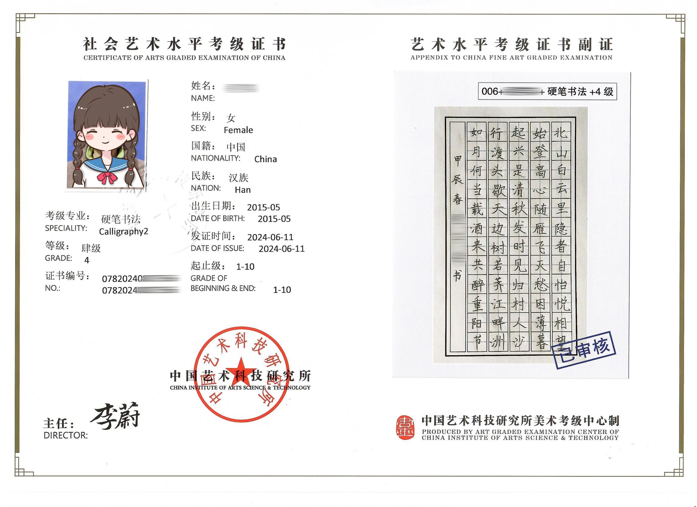美术证书内页